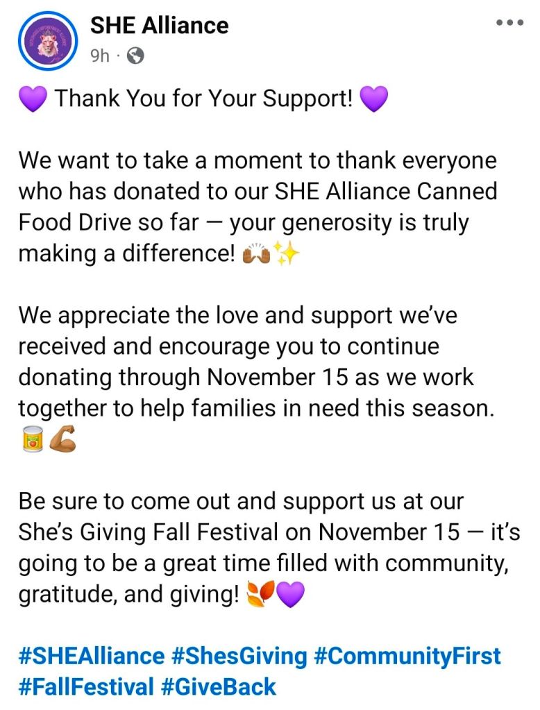 #CommunityStrong #SHEAlliance #ShesGiving #CommunityFirst #FallFestival #GiveBack